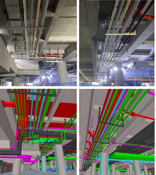 以创新为魂,筑牢工程质量新防线。机电安装管线密集、精度要求高,项目部设立“精度管控责任区”,以“科技赋能无返工”为誓言,推动BIM+AR技术深耕精度管控。开展“模型与现场双核对”,用AR工具标注管线关键信息,配合测量仪器实时校准。数据见证蜕变:A2栋机电管线安装平均绝对位置偏差从传统施工的±35mm锐减至±5mm,核心筒对接精度达99%,隐蔽工程误差整改率100%。对比之下,应用新技术的楼栋全程无返工,项目整体返工率降低70%,彻底告别传统施工“错改反复”的困境。