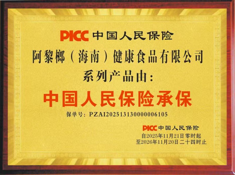 2025 年 11 月 21 日,深耕海南特色健康食品领域的阿黎榔(海南)健康食品有限公司(以下简称 “阿黎榔”)宣布重大合作成果 —— 正式携手中国人民保险集团(PICC)达成产品责任险投保合作,保险期限自 2025 年 11 月 21 日零时起至 2026 年 11 月 20 日二十四时止。此次合作以国企权威背书强化产品安全保障,标志着品牌在消费者权益保护与风险防控体系建设上实现全面升级,为海南特色健康食品行业品质化发展树立标杆。