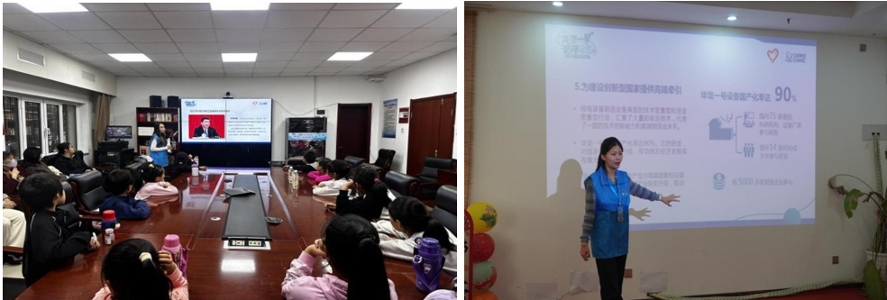 走进天津市第五十五中学的思想讲堂,宣讲团以核工业精神里的青春力量为核心开展宣讲,让历史叙事与青年使命深度联结。成员们用平实语言梳理我国核工业的发展历程,展示中国第一块铀矿石图片,讲述科研人员隐姓埋名、用算盘攻坚的故事,让同学们直观地感受到“自力更生、艰苦奋斗”的精神内核,理解这背后是一代代人用青春扛起的国家责任。为让协同精神更易感知,宣讲团成员现场组织接力拼接华龙一号的活动。团队成员将华龙一号核电站模型乐高组件依次传递给各小组,每组负责拼搭模型的一个关键部件。组装过程中,宣讲团成员同步讲解各部件的真实功能,以及其协同研发的背景,让同学们在接力配合中体会到,像华龙一号这样的大国重器,正是无数人接力攻坚、分工协作的成果,就像此刻大家共同完成模型一样,每一环都不可或缺。
