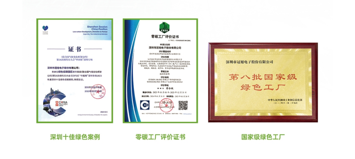 从原材料选择到生产流程优化,从能源消耗控制到废弃物回收,冠旭电子成为行业内率先实现制造流程端到端绿色升级的企业,并在2024 年 2 月正式通过 “零碳工厂” 认证;其绿色低碳园区入选2023 年迪拜联合国气候变化大会“深圳十佳绿色低碳案例”。