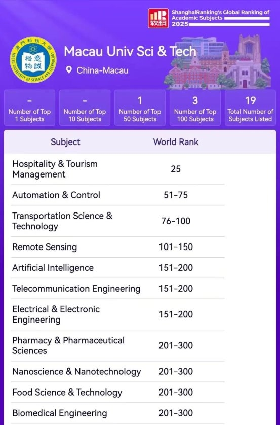 2025年11月18日,上海软科发布「2025世界一流学科排名」(ShanghaiRanking's Global Ranking of Academic Subjects),澳门科技大学表现突出,共有19个学科上榜,较去年新增7个学科。其中旅游休闲管理学科(Hospitality & Tourism Management)表现尤为亮眼,排名提升至全球第25名。新增7个学科分别为遥感技术、人工智能、生物医学工程、食品科学与工程、能源科学与工程、工商管理、管理学,展现其学科布局的持续拓展与优化。