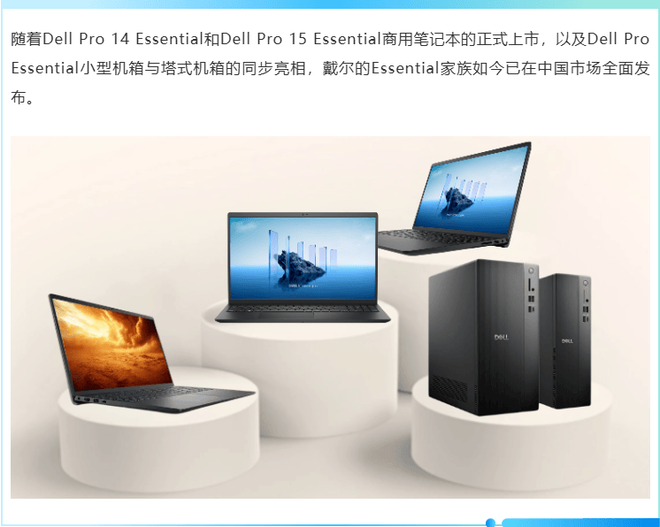 如今,Dell Pro Essential系列作为戴尔科技集团推出的商用机型, 象征着戴尔在高效务实市场的最新发布。