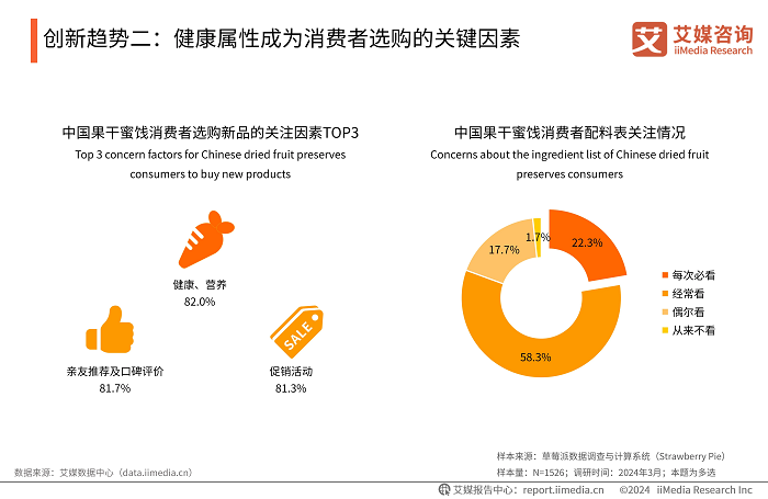 从发展趋势来看,行业正沿着三大方向加速迈进。一是产品创新多元化,传统单一果干逐渐向混搭形态延伸,如青梅抱葡萄、果干坚果组合等,凭借层次更丰富的口感和营养搭配,成为吸引消费者的主流方向;二是健康属性极致化,随着消费者健康意识觉醒,无添加防腐剂、少糖低卡、保留天然营养的产品更受青睐,82.0%的消费者选购新品时优先考虑健康属性,80.6%会重点查看配料表,“清洁标签”成为品牌创新的重要方向;三是场景适配精细化,针对办公零食、户外补给、节日伴手礼等不同场景,品牌推出小包装、便携装、礼盒装等细分形态,进一步拓宽消费边界。