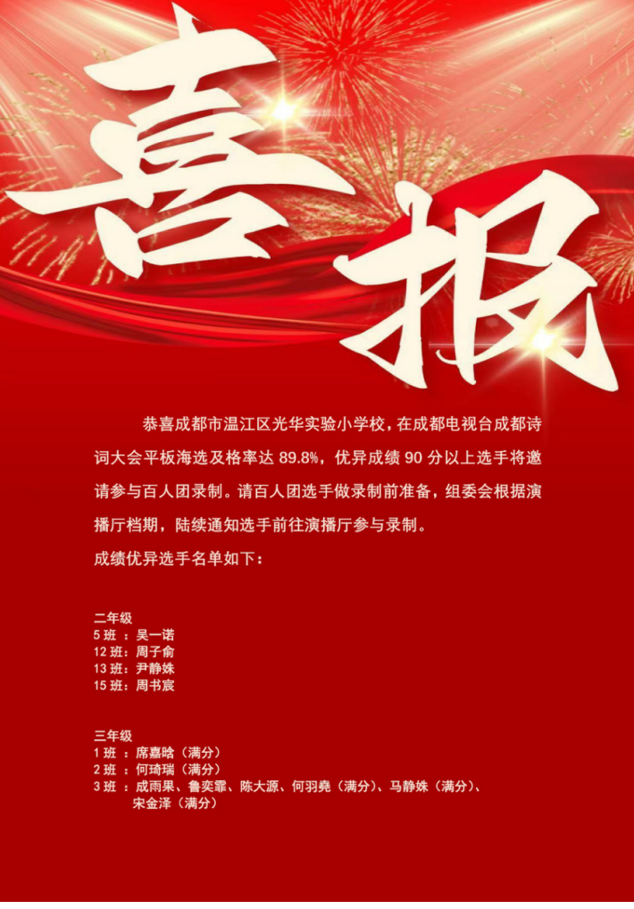 特此报喜,并向所有参赛同学及辛勤指导的语文教研组教师们表示热烈祝贺!愿全体光华学子以此为契机,继续在古典诗词的浩瀚海洋中扬帆远航,在未来的更大舞台上,继续绽放属于光华实小的独特光芒!