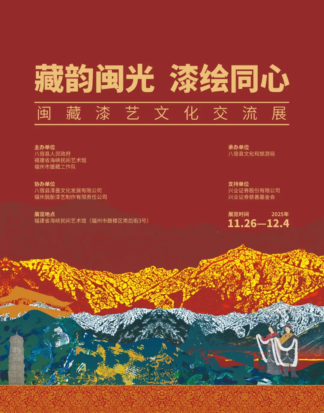 2025年11月26日,由八宿县人民政府、福建省海峡民间艺术馆、福州市援藏工作队主办,八宿县文化和旅游局承办的“藏韵闽光 漆绘同心——闽藏漆艺文化交流展”在福建省海峡民间艺术馆开幕。