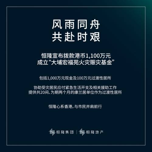 恒隆亦藉此向连日来不眠不休投入救援工作的消防、警务、医护和前线人员,致以衷心感谢及崇高敬意。我们将继续与社会各界携手,为社区提供适切支援,协助市民渡过难关。