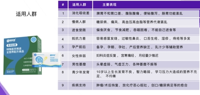 从人群覆盖分析。据新华网数据显示,我国每年病患约2.2亿人次,规范使用特医食品可显著提高患者生存率、缩短住院时间;除此之外,对于因饮食不规律、挑食偏食、年龄增长等因素,导致出现营养摄入不足或不均衡等问题的部分人群,特医食品可提供易吸收、高适配的营养方案,为广大人群提供“生存与健康”的双重保障。