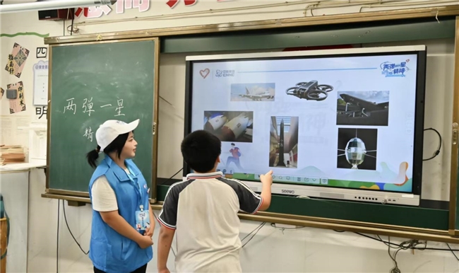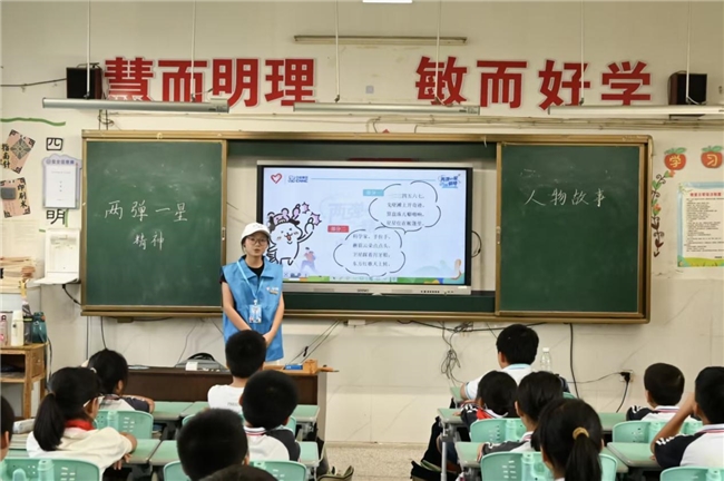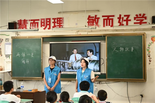 “国家的算盘上,总得有人当颗顶用的珠子。”在舒缓的背景音乐中,宣讲员向孩子们介绍“两弹一星”元勋陈能宽放弃剑桥大学优渥条件、隐姓埋名二十五载的感人事迹。质朴的故事和真挚的爱国情感令在场孩子们深有感触,纷纷举手回答自己的看法,表达对陈能宽的敬佩之情。