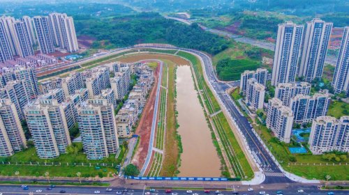 用民生温度丈量城市发展,蜿蜒的螺溪河宛如一条碧绿丝带,串联起会展中心与嘉陵江两岸风光,勾勒出一幅动人的城市画卷。为降低水土流失,保障堤岸安全,项目配套建设的5.4千米防洪堤创新采用斜面护坡和四级阶梯式生态护坡工艺,增强堤岸稳定的同时扩大坡面绿化空间。堤顶宽约2米的步行道搭配夜间照明设施,并在关键河段设置观景点,形成了“观江—游河—赏绿”的亲水平台,居民在休闲之余可以漫步江畔,赏夕阳美景,与会展中心打卡合影。