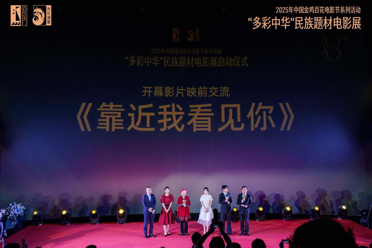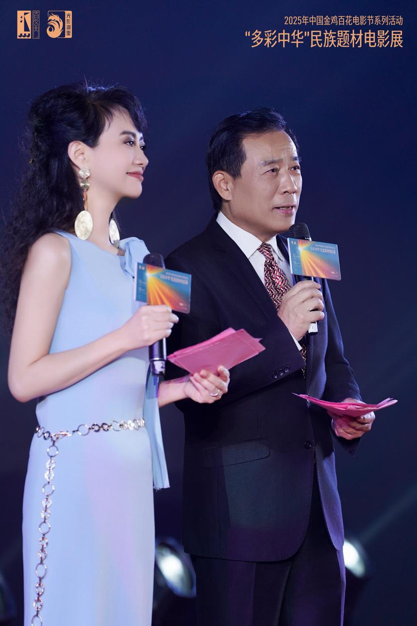 开幕影片《靠近我看见你》导演江平与著名表演艺术家祝希娟,制片人刘骋,演员袁霆、李木子、孙佳文共同上台,与现场观众做映前交流。江平导演深情地讲述影片的创作历程,为民族电影而创作的热爱,热切地说道:“电影万岁!”这一幕给居文沛留下了深刻的印象,对于电影艺术的热爱,在影展的舞台上共鸣、回响。她难掩激动地表示:“今年很荣幸和夏衍电影学会会长、著名导演、制片人江平导演共同主持‘多彩中华’民族题材电影展映活动启动仪式。我作为演员,也曾经与苏有朋一起主演过江平导演的《康定情歌》中的达娃。那是一段难忘的经历:为了贴近角色,我必须深入体会那段历史。江平导演告诉我,我脚上的脚镣正是赵丹老师当年拍摄时使用过的真实道具;我身上的羊皮袄,也是几十年前剧组留下的真实衣物。当我完全投入到这段历史与文化之中,整个人仿佛被岁月浸润——我要表达的,正是《康定情歌》所呈现的那份跨越时空、感动岁月的深情爱恋,和一个藏族女孩心中执着而炽热的爱。”