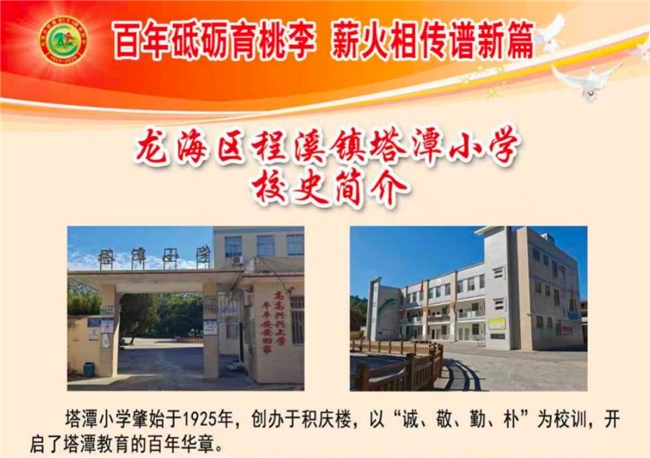 塔潭小学的百年征程,始于1925年民国年间的积庆楼初创小学。方言授课的启蒙时光里,教育火种在战火迁徙中顽强存续——1934年校舍被占,师生迁址祠堂;1935年积庆楼焚毁,“下楼祠堂”接续办学使命。解放后,学校历经更名迁址,从“南靖县塔潭小学”到“龙海区程溪镇塔潭小学”,从借居民居授课到2012年现代化新校舍落成,唯一不变的是“教书育人”的赤诚初心。