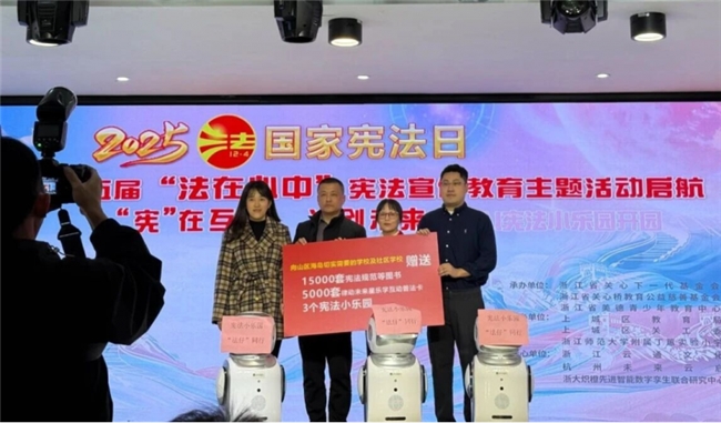 11月28日下午,在第十二个国家宪法日来临之际,全省青少年第十四届“法在心中”宪法宣传教育主题活动启动仪式在杭州市上城区浙师大附属丁蕙实验小学隆重举行。作为本次活动的社会爱心单位,杭州未来云启向山区、海岛等切实有需要的学校及社区学校捐赠5000套《律动未来星》乐学互动普法卡牌及万本法治图书、宪法小乐园等教资道具,以实际行动践行企业社会责任,推动优质法治教育资源向基层深度覆盖。