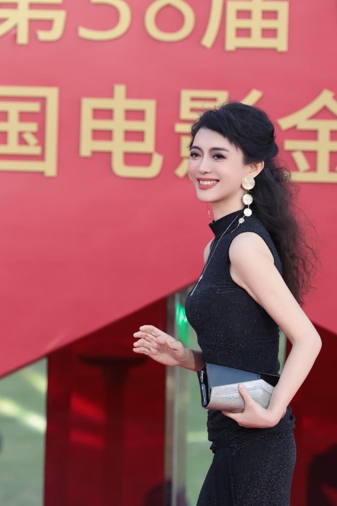 居文沛一袭墨黑金丝长裙走上红毯,尽显高贵典雅