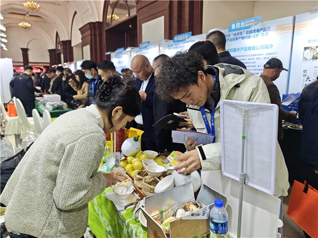 展示展销区人头攒动,各类优质农产品集中亮相:北部湾大蚝、金鲳鱼、墨鱼仔、八爪鱼等海产鲜气扑面而来,鳗鱼、水库大头鱼、小龙虾及稻渔有机米尽显生态本味,鱼丸、鱼豆腐、熟虾、虾滑、脆鲷鱼片等多元加工产品更是丰富了产品矩阵,全方位展现广西特色水产品的多样价值。