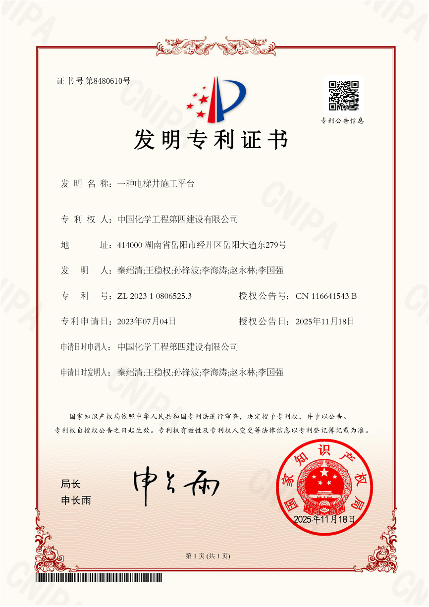 近日,由中国化学工程第四建设有限公司(简称:四化建)华东公司西咸新区项目部自主研发的“一种电梯井施工平台”获国家发明专利证书。这是项目部聚焦施工一线痛点、以技术创新赋能安全生产的重要成果。