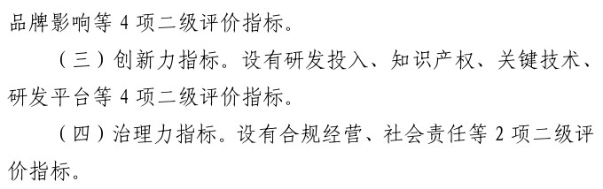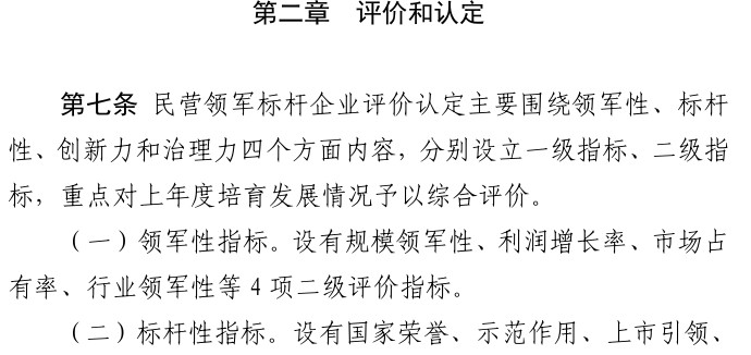 第二,《办法》表明,民营领军标杆企业评价认定主要围绕领军性、标杆性、创新力和治理力四个方面内容进行评定。