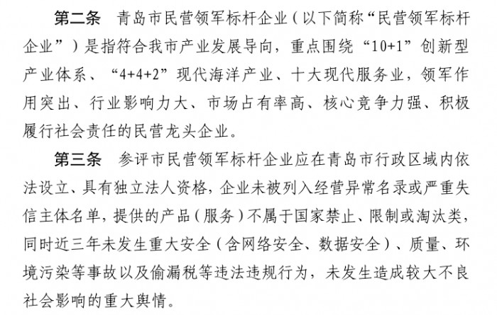 海创汇为什么能入选青岛民营领军标杆企业?据《青岛市民营领军标杆企业认定培育办法》(以下简称“《办法》”),第一,此次民营领军标杆企业的申报范围有五项,分别为青岛市内工商注册登记、具有独立法人资格,重点围绕“10+1”创新型产业体系等行业以及近三年未被列入经营异常名录或严重失信主体名单等要求。