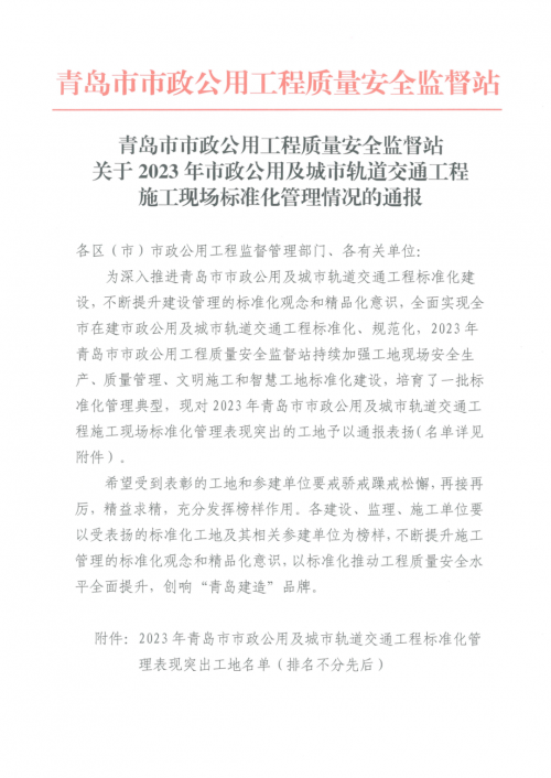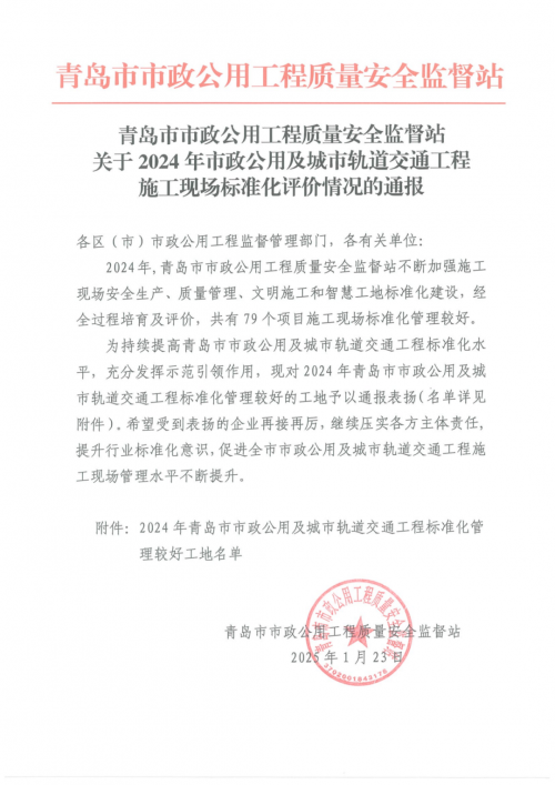 项目结合各施工工序特点,聚焦安全管理中的问题隐患,加强对动火作业、有限空间、高处作业、带电作业等内容的监督管理,每日常态化检查,对问题实施系统性跟踪,确保按期整改闭环。项目经理带队定期开展“安全隐患大排查大整治”行动,常态化推进国家安全宣传教育,认真策划组织安全生产月、消防安全月等主题活动,推动安全生产文化深入人心,促进员工从“要我安全”到“我要安全”的意识转变,有效提升安全管理水平。项目连续两年获得青岛市“标准化工地”的称号、公司2024年度“安康杯”竞赛优胜单位。