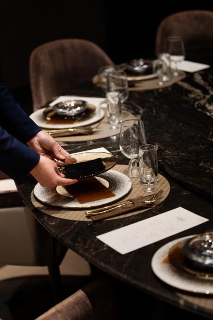 走进项目,数十米宽度的入口前场,原木色九层穹顶造型的“永恒之树”,以西安古观音禅寺千年银杏树为原型,顶面“菱形造型”,搭配三重叠水,仿佛一段充满张力的开场白,环岛式入户大堂,更是为尊贵生活体验拉开序幕。