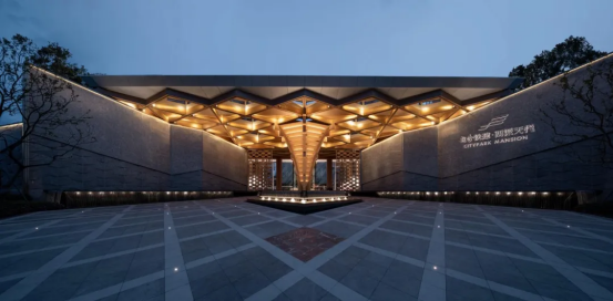 悬浮式的空中院馆设计,以无框玻璃围合,模糊建筑与自然的界限,夜晚宛若悬浮于城市上空的星光盒子。