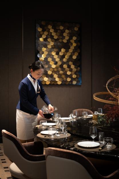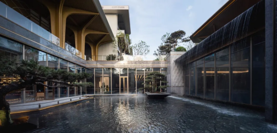 在这里,乌桕与美国红枫等名贵树种,枝桠交错成天然穹顶,内置的“山水盒子”与“琉璃屏风”呼应出山水意境,中央水院内流水如瀑,营造出沉静内敛的东方意境。花木随风轻摆,水汽氤氲间,书写出自然雅逸的人居氛围。
