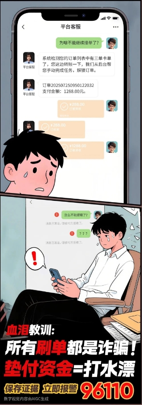 刷单返利陷阱:首单返 10 元引你入局,后续 “连环任务” 套走钱财,切记 “所有垫资兼职都是诈骗”。