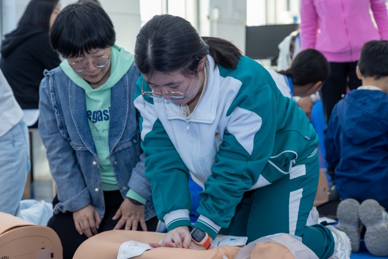 心肺复苏体验区同样热度不减。专业医护人员借助模拟人教具,生动演示胸外按压、人工呼吸的标准流程,对按压深度、频率、呼吸配合等关键细节逐一拆解,并用通俗语言解答亲子家庭的疑问。活动中,亲子组合两两结对,相互充当“急救者”与“患者”,在反复练习、相互纠正中熟练掌握“30次按压+2次呼吸”的核心操作规范。专门设置的“急救闯关”环节,要求学生独立完成完整急救流程,不少孩子凭借扎实的练习顺利通关,眼神中满是成就感与责任感,切实将应急技能转化为自身本领,呼应了青少年急救教育行动计划的实施要求。