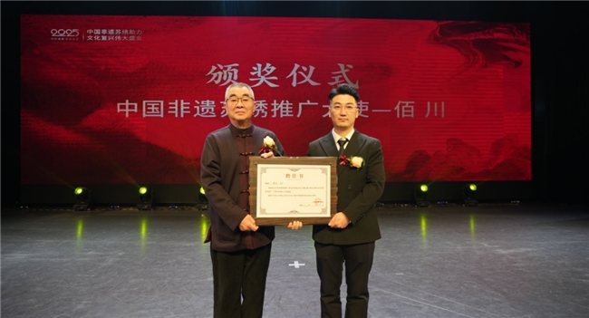 盛会现场同步举行了 “中国苏绣非遗推广大使” 荣誉授予仪式,国务院行政司原副司长王胜利登台,为佰川先生颁发荣誉证书及奖杯。佰川先生在发表感言时表示:“获此称号,我深感荣幸,也深知责任重大。苏绣的美,需要更多元的传播方式,我会努力推动非遗苏绣的传播,让这门千年技艺在新时代焕发更强的生命力,助力中国文化走向世界。” 此前,王胜利司长还特意将亲笔挥毫的墨宝赠予佰川,既饱含对非遗事业薪火相传的期许,更彰显对他深耕苏绣推广的肯定。