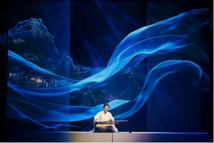 音乐会在舞台视觉呈现中打造沉浸式美学空间。《幽兰》一曲中,灯光以幽蓝为主调,与琴音、吟诵共同构建出“空谷幽兰”的意境空间;《潇湘水云》古琴演奏时,呈现云水交融、山峦隐现的动态画卷,配合灯光营造的朦胧雾气,精准诠释了南宋琴家郭沔“借云水以寄故国之思”的深远意境。