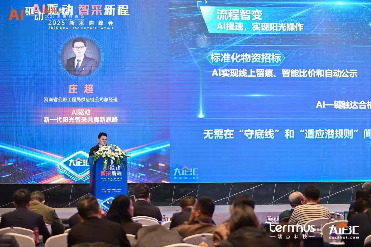 河南省公路工程局供应链公司总经理庄超在《AI驱动,新一代阳光智采共赢新思路》分享中,以“正念共赢”为核心阐述AI如何重塑采购生态, AI赋能采购正将集中采购从利益“博弈场”重塑为协同“共赢圈”。 通过全流程透明化与智能风控,AI不仅筑牢了廉政防线,更赋能年轻从业者从执行者成长为战略引领者,在“阳光采购”中实现个人与企业的共同价值提升。