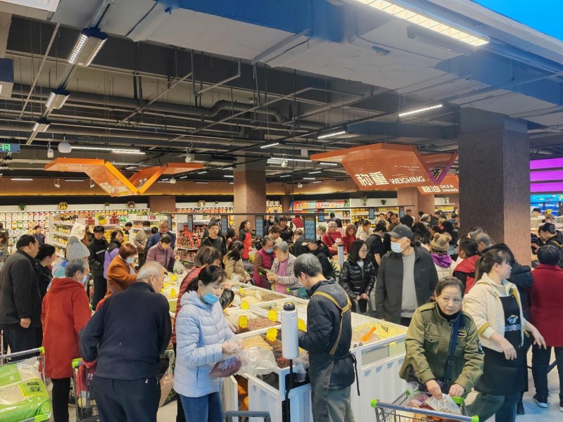 超市内琳琅满目的商品吸引了不少市民驻足选购——新鲜翠绿的蔬菜、色彩鲜艳的水果、鲜活的水产生鲜以及各式各样的日常生活用品,品类齐全、应有尽有,满足了周边家庭“一站式”采购需求。许多顾客穿梭在各个区域,手里拎着满满的购物袋,真实体现了该超市作为“老百姓的购物超市”的便利与实用。这是一家致力于改变您购物习惯的超市!
