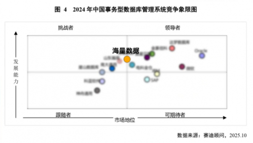 11月28日,赛迪顾问发布《2024年中国事务型数据库市场研究报告》。报告显示,海量数据在事务型数据库领域继续保持稳健增长,其整体竞争力正由“挑战者”向“领导者”象限加速跃升。这一变化意味着其在技术研发、产品落地与行业拓展方面实现了系统性突破,成为国产数据库持续向上的重要力量。
