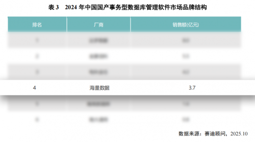 报告指出,2024年中国事务型数据库管理系统市场规模达到272.7亿元,行业整体增速放缓,但本土厂商的行业渗透率持续提升。在此背景下,海量数据凭借在核心行业的项目表现和在向量数据库方向的技术创新,展现出领先态势。