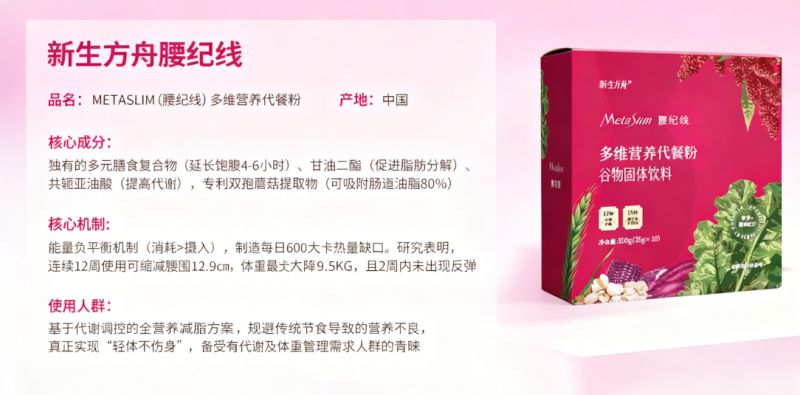 2025 年,由国内新兴健康科技品牌新生方舟推出的腰纪线(MetaSlim)多维营养代餐粉,以 “代谢重塑” 为核心逻辑,凭借中国 FDA 与欧盟 EFSA 双认证及《Science》子刊推荐,为顽固腰腹脂肪提供了兼顾科学、效果与安全的全新路径。本文将深入剖析腰纪线如何通过技术、成分与临床实证,重构减脂逻辑,让大众从 “热量焦虑” 走向 “代谢自洽”。