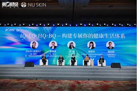 压轴的圆桌论坛以“IQ·EQ·HQ·BQ——构建专属你的健康生活体系”为主题,在第一财经新一线研究院主编沈从乐的主持下,第一财经大消费特约观察员唐健盛、奥运冠军、庄主好时光创始人庄泳、SGS化妆与清洁护理用品服务中国区总监郁琼花、心理学博士、科普作家魏知超一起,展开了精彩对话。