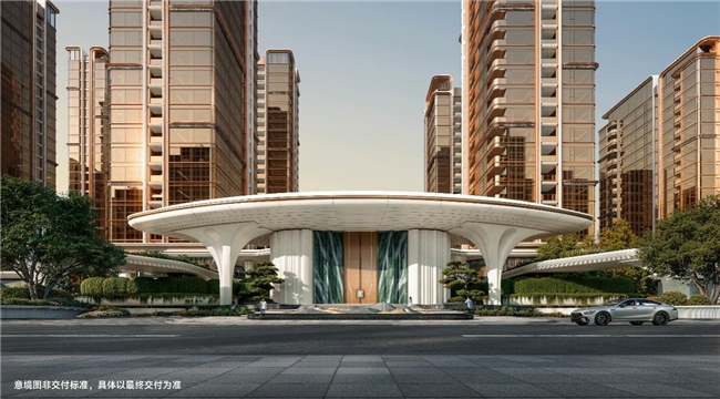 主入口以“城市雕塑”为理念,打造连续约230米界面,约60米宽度主门与约12米悬挑,以恢宏气势致敬城市,让归家成为审美体验,让建筑成为城市记忆。