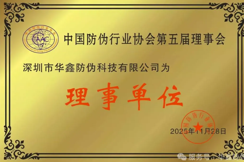 行业认可,责任在肩。近日,经中国防伪行业协会严格评审与选举,深圳市华鑫防伪科技有限公司正式成为中国防伪行业协会第五届理事会理事单位。这一重要身份的认定,标志着华鑫防伪在技术研发实力、行业实践贡献及品牌综合声誉等方面,已获得国内权威防伪行业组织的高度认可与充分肯定。