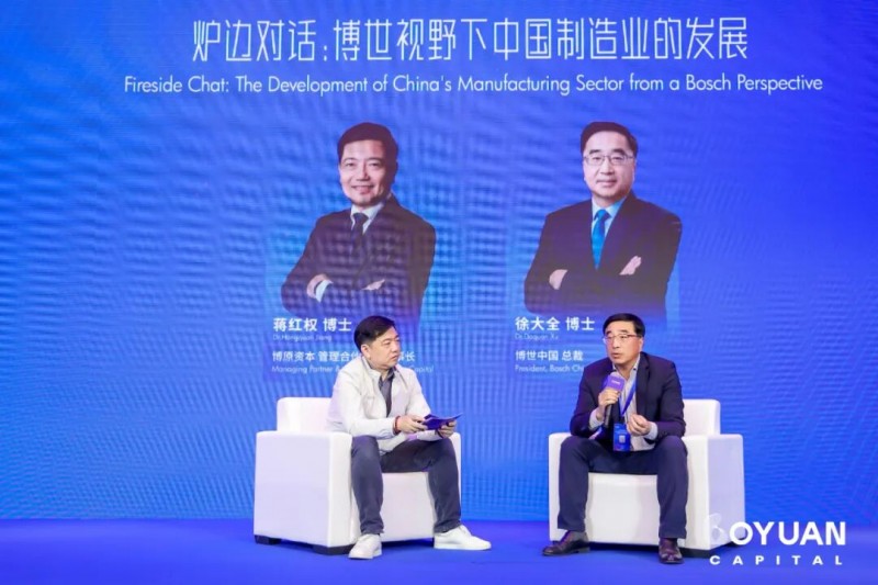 作为大会的重要环节,博世中国总裁徐大全博士在与蒋红权博士的对话中,从全球领军企业视角分享了对中国制造的观察。他指出,在全球增长承压的背景下,中国市场尤其在电动化、智能化领域所展现的创新活力与“中国速度”,正推动其从“本地化生产”基地向“服务全球”的研发策源地转变。徐大全博士特别强调,面对供应链重构,博世积极寻求与中国本土企业合作以增强体系韧性。他高度认可博原资本作为“关键连接器”的作用:“博原能精准洞察博世的战略需求与创新生态,高效链接双方。未来我们有望在AI、机器人等领域携手投资,共同推动产业升级。”