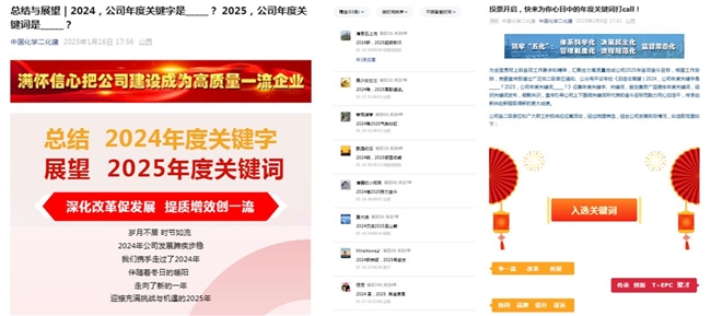 2025年初,中国化学二化建党委通过广泛向二级单位征集和公众号开设专栏《总结与展望 | 2024,公司年度关键字是_____? 2025,公司年度关键词_____?》征集职工留言,确定公司2025年度关键词投票范围,围绕候选关键词在公众号开设《投票开启,快来为你心目中的年度关键词打call!》投票专栏,通过三上三下提炼了2025年度关键词“争先(争一流)”,并制定了详尽的《“争先(争一流)”活动实施方案》。
