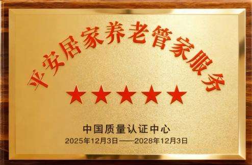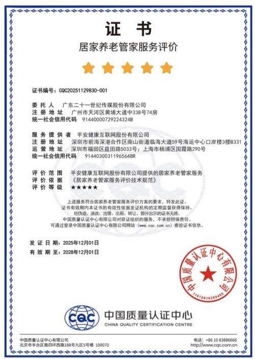 近日,中国平安旗下平安居家养老管家服务通过中国质量认证中心(CQC)权威评价,成为全国率先获得“居家养老管家服务”五星级评价的养老服务,证书编号为CQC20251129830-001.有效期至2028年12月01日。这一评价为国内居家养老行业高质量发展树立了标杆。