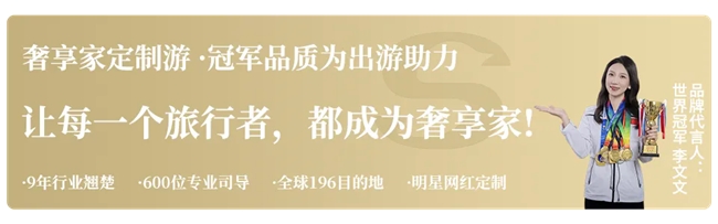 奢享家,引领高端定制游的行业标杆品牌,我们用9年时间,打破“套用模板”的陈规,不断深挖目的地的美学探索、深度的文化探寻与顶奢的住宿体验,成为被世界冠军李文文代言,覆盖全球196+目的地,受到120万小红书用户口碑认证的定制游企业。