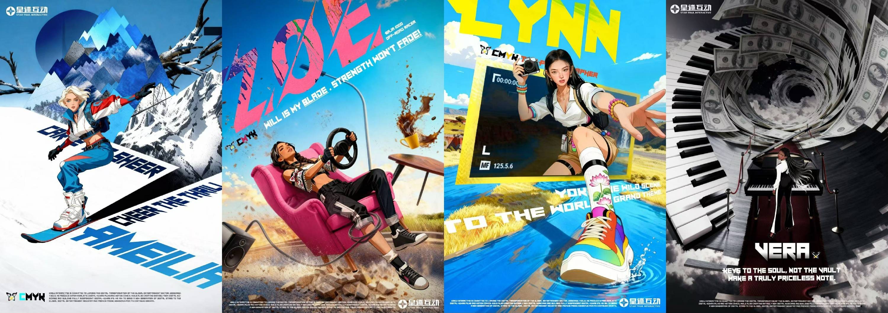 CMYK四位成员各具特色:来自白人极限运动员Amelia(Cyan)诠释冒险精神,拉美的汽修机械师兼赛车手Zoe(Magenta)代表工业美学与创造力,东南亚野生动物纪录片导演Lynn (Yellow)关注环保议题,非裔管风琴乐手Vera (Black)则以音乐挑战偏见,这种以真实职业为背景的设定,突破了虚拟偶像的传统框架。