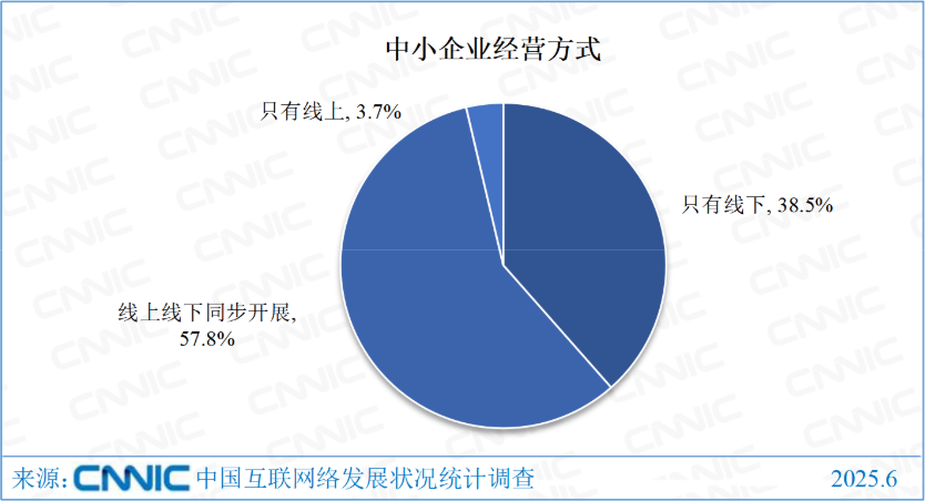 《报告》显示,近年来,中小企业纷纷加入数字时代的变革浪潮之中,以数字新动能铸就发展新优势,线上与线下双线并行,积极推动数字化转型,为实体经济与数字经济深度融合提供助力。中小企业针对自身业务特点,不断拓展线上和线下业务渠道,促进业务协同发展。截至2025年6月,在受调查的职业为中小企业员工的网民中,57.8%提出所在企业采取线上线下同步开展或以线上(线下)为主、线下(线上)为辅的经营方式,进一步拓展自身产品及服务的辐射范围。