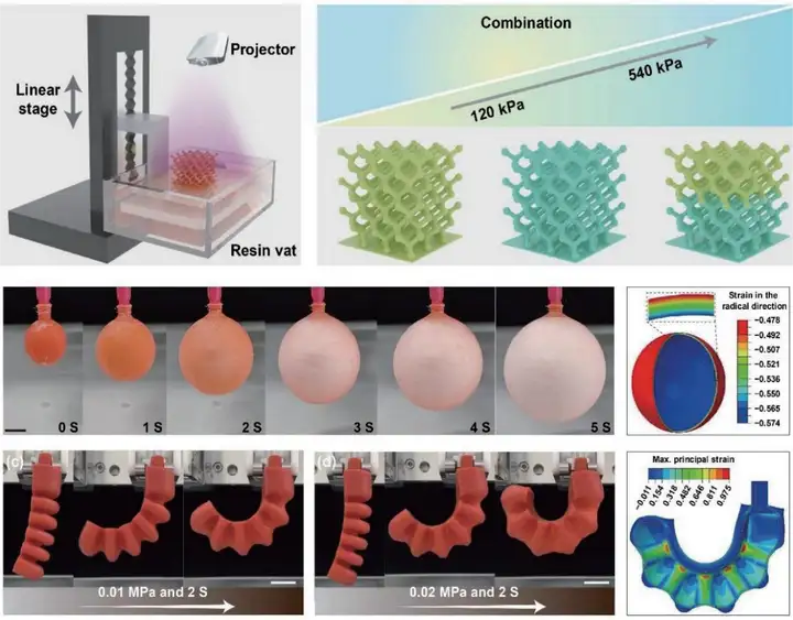 对于高精度光固化 3D 打印硅橡胶(SR)结构器件而言,针对传统 SR 成型方法依赖热处理或 3D 墨水直写精度差、效率低、步骤繁琐等问题,研究人员结合巯基 - 烯点击反应的快速光固化和二次热交联策略,设计并构建了如超材料结构、血管模型和微柱状阵列等各种复杂形状的 SR 弹性体结构,且这些 SR 弹性体结构在各种条件下均表现出卓越的稳定性,包括高低温和各种有机溶剂等。作为应用演示,研究团队利用这项技术成功地一步制造了一系列具有微尺度空隙和通道的基于气体驱动的SR 致动器和抓取器,并实现了对各种形状物体的抓取、运输和释放等操作能力(图 4)。因此,这种兼具高打印精度、快速成形能力和复杂结构设计灵活性的光固化 3D 打印 SR 弹性体有望在软体致动、柔性电子和医疗器械等领域得到广泛应用。