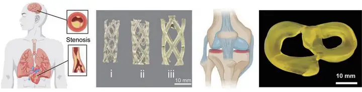 针对心血管狭窄与阻塞等常见心血管疾病,团队设计并制造了具有不同尺寸结构的高性能聚氨酯心血管支架,展示了该支架具有良好的承载能力、机械稳定性和生物相容性。针对半月板损伤或置换等问题,基于单体结构优化和光固化3D 打印技术实现了高强、润滑、耐磨聚氨酯半月板的个性化仿生制造,所制造的仿生半月板在机械强度和润滑性能等方面均与天然半月板相匹配。这些研究为兼具优异承载性和机械稳定性的复杂柔性结构生物医疗器械的制造提供了材料基础和技术方案。