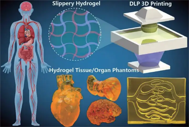 水凝胶组织器官模型制造层面来说,研究人员通过 3D 打印热可逆水凝胶模板辅助超分子组装策略,构筑了具有任意复杂结构的中空水凝胶器官模型和仿生血管网络,这些模型具有良好的结构完整性、可控的尺寸形状、大跨度的中空腔室及优异的机械性能。后来,研究人员又提出了基于双交联网络和氢键网络等策略,制备了刚度可调的湿滑水凝胶材料体系,并借助数字光处理 3D 打印技术实现了各种结构复杂、保真度高、力学可调的湿滑水凝胶软组织器官模型,且这些组织器官模型具有复杂的内部流体通道、腔体结构及血管网络等结构(图 1)。相比于直接利用活体器官或者动物实验甚至人体临床实验,这些结构化的体外模拟组织器官模型具有低成本、合乎伦理道德、易于操作执行等显著优势。