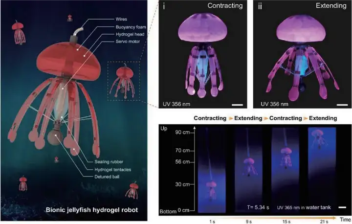 在水下粘附与深海应用探索方面,研究人员受章鱼吸盘结构启发,利用力学性能可调控湿滑水凝胶和光固化 3D打印相结合的策略,发展了具有可切换粘附性能的水凝胶吸盘结构,并实现了对水下超软物体的无损抓取和释放。此外,将这类水凝胶吸盘阵列结构集成到水下无人航行器的腹部或机器人的足部,可让这些机械人拥有在水下切斜面和倒立面上的爬行移动和精准驻足等操作能力。随后,研究人员又利用溶剂调控与相转化氢键重构相结合策略,发展了具有热致红色荧光特性的超分子水凝胶,并设计并制造了仿生荧光水凝胶水母机器人,该荧光水母机器人在电机驱动下可在水下自由游动,并表现出良好的机械性能(图 2)。
