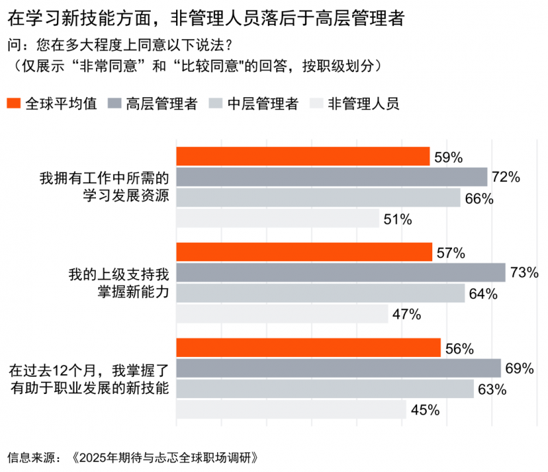 技能提升感知差异:非管理人员在学习发展的资源获取与职业发展前景上显著落后于高层管理人员