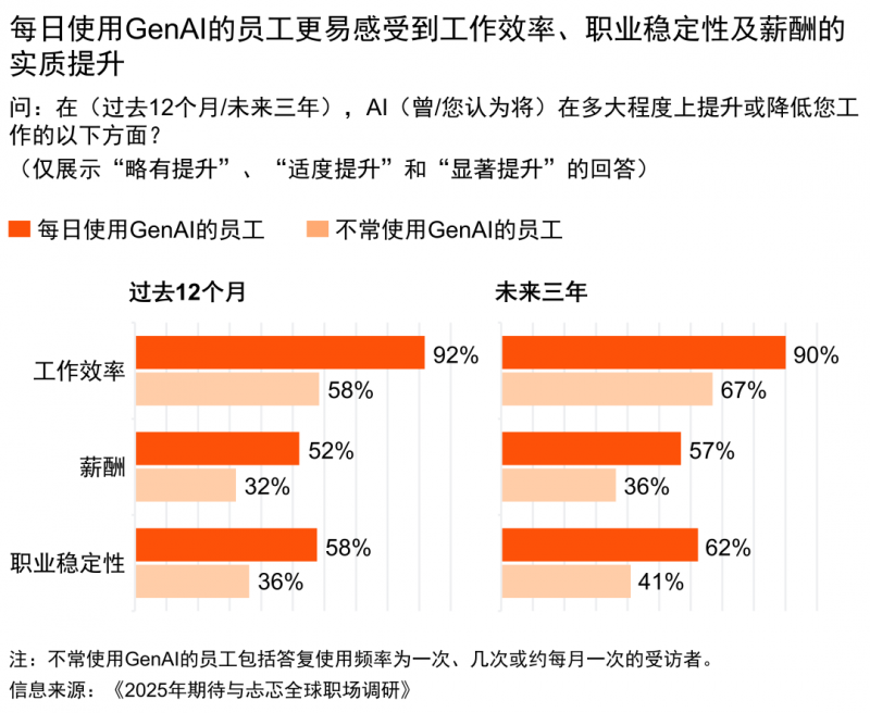 普华永道最新发布的《2025年期待与忐忑全球职场调研》(Global Workforce Hopes and Fears Survey 2025)显示,过去一年中每日使用GenAI的职场人表示,其工作效率得到了提升,并且可以获得更好的职业稳定性和薪酬回报。