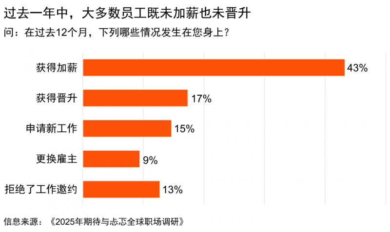 财务压力是影响员工积极性的重要因素。全球55%的职场人正面临财务压力,较2024年的52%持续上升。超三分之一(35%)的员工每周至少一次感到不堪重负,其中Z世代情况更为严峻,比例高达42%。薪酬与晋升机会的减少进一步加剧了这一困境。过去一年中,仅43%的受访者获得加薪,晋升比例更是不足五分之一(17%)。受经济环境趋紧影响,员工主动争取加薪和晋升的意愿也同比下降:加薪意愿从43%降至37%,晋升意愿从35%降至32%。